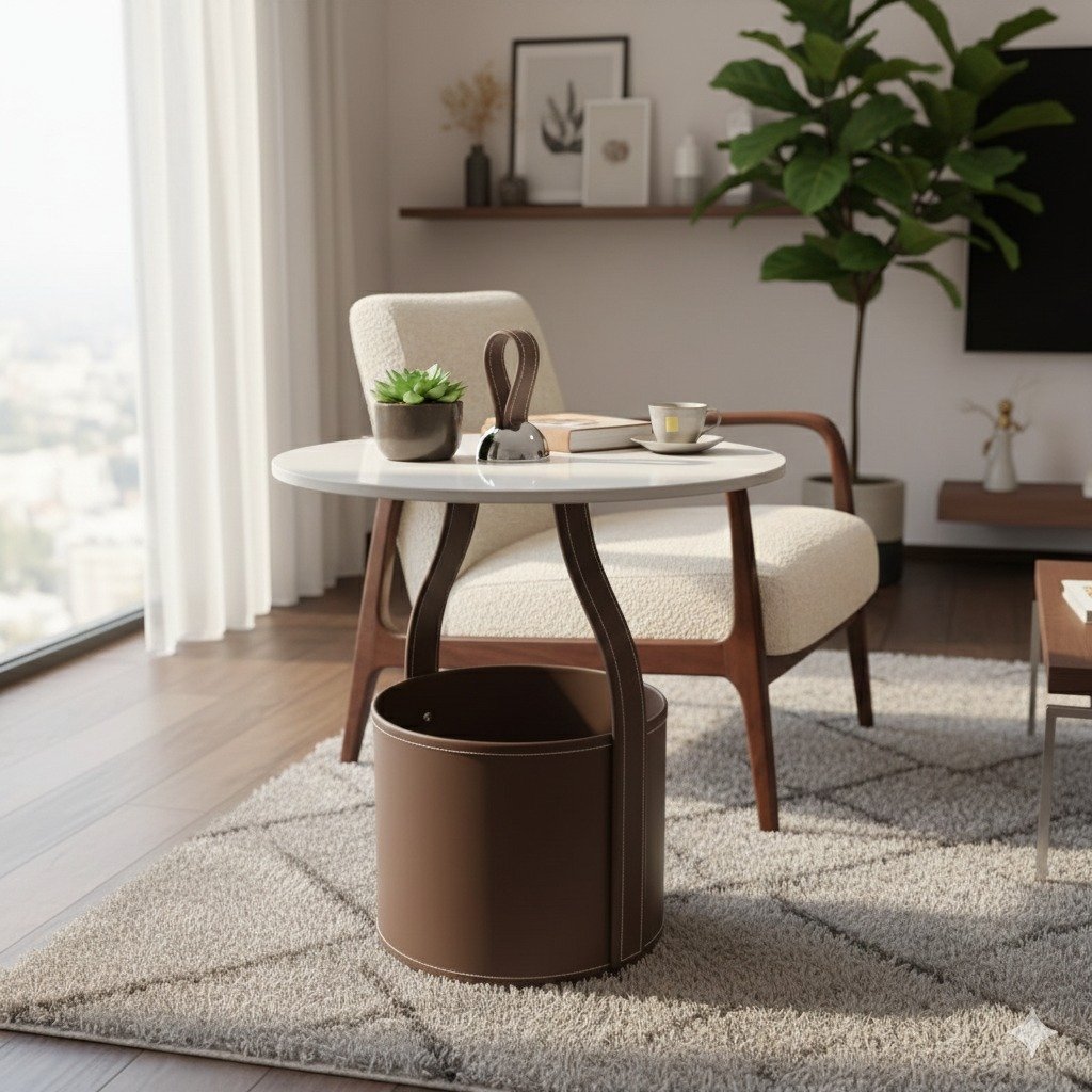 Introducimos nuestra mesa auxiliar para sala con un toque industrial chic: la mesa auxiliar de Cuero y Piedra Sinterizada. Diseñada para complementar tu espacio con un estilo moderno y funcional, esta mesa es la combinación perfecta de durabilidad y elegancia.